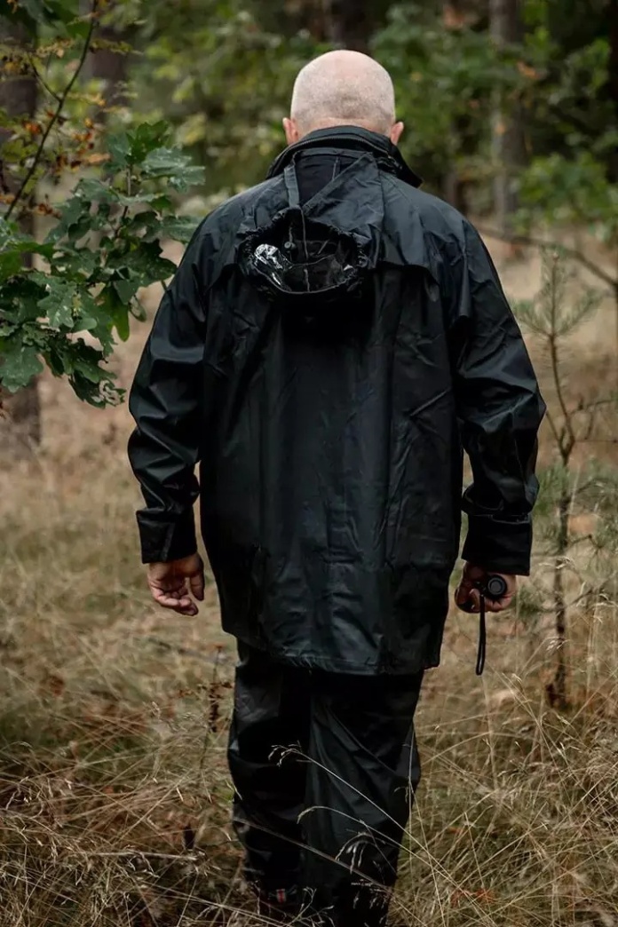 👕 Wysoki kołnierz i regulowany kaptur – lepsza ochrona szyi i głowy przed deszczem.