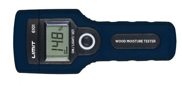 Wilgotnościomierz Limit 6101 kod 233840206 to łatwy w obsłudze, ręczny wilgotnościomierz przeznaczony do pomiaru zawartości wilgoci w drewnie. Pomiar odbywa się poprzez wciśnięcie w materiał dwóch kolców pomiarowych, a wynik odczytujemy bezpośrednio na podświetlanym wyświetlaczu LCD. Urządzenie posiada funkcję kalibracji, pięć grup materiałowych do wyboru i automatyczne wyłączenie podświetlenia po 30 sekundach.