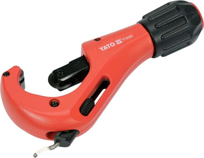 Profesjonalny obcinak do rur YT-22333 o zakresie cięcia 3–42 mm, przeznaczony do pracy z rurami miedzianymi, aluminiowymi, stalowymi i PVC. Korpus wykonany z wytrzymałego stopu cynku (ZNAL), malowany proszkowo dla lepszej odporności na korozję. Dzięki czterem rolkom prowadzącym, precyzyjnemu ostrzu z hartowanej stali GCr15 oraz wbudowanemu gratownikowi, gwarantuje czyste, równe cięcia i idealne przygotowanie rury do montażu.
