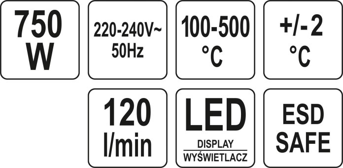 Precyzja i kontrola: Płynna regulacja temperatury w zakresie 100-500 °C oraz stabilność temperatury ±2 °C pozwalają na idealne dopasowanie do każdego zadania, a funkcja pamięci ustawień umożliwia zapisanie ulubionych nastawów.