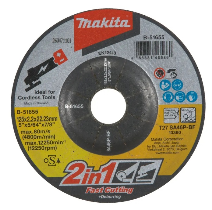 Makita B-51655 to profesjonalna tarcza szlifierska typu 2 w 1, stworzona z myślą o szybkiej, czystej i precyzyjnej obróbce metalu oraz stali nierdzewnej. Wyróżnia się ziarnistością SA46P, która łączy wysoką wydajność skrawania z delikatnym wykończeniem powierzchni.